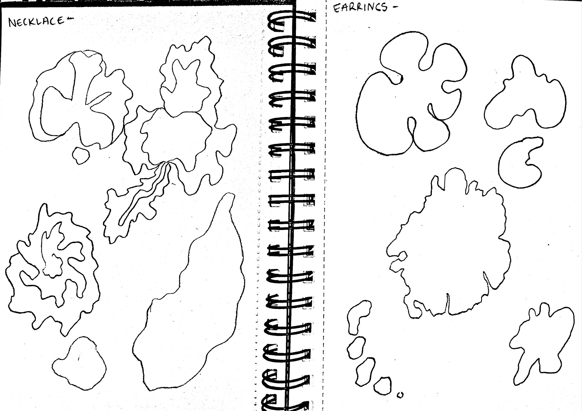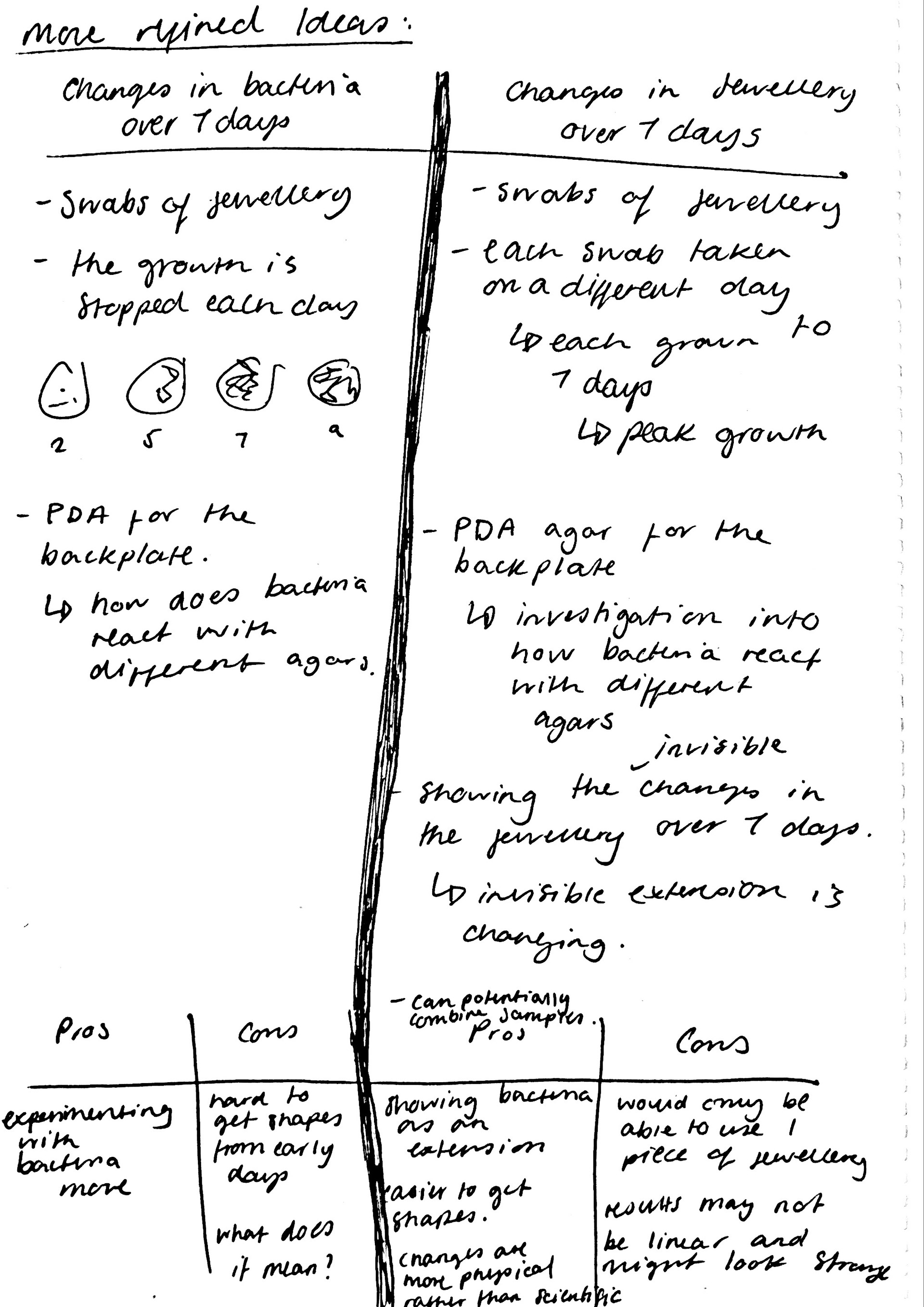 To begin my sampling, I needed to use cultures from jewellery again. Since I had been advised against growing bacteria in my flat by a microbiologist, I decided to use samples from Unit X. These were still relevant and would help me establish a workflow and explore ideas. I examined the cultures, focusing on the diverse shapes that had formed. I then translated these shapes into my sketchbook, exploring how bacterial growth varied significantly, both within the same sample (e.g. my ring) and across different samples (e.g. my ring compared to my necklace).