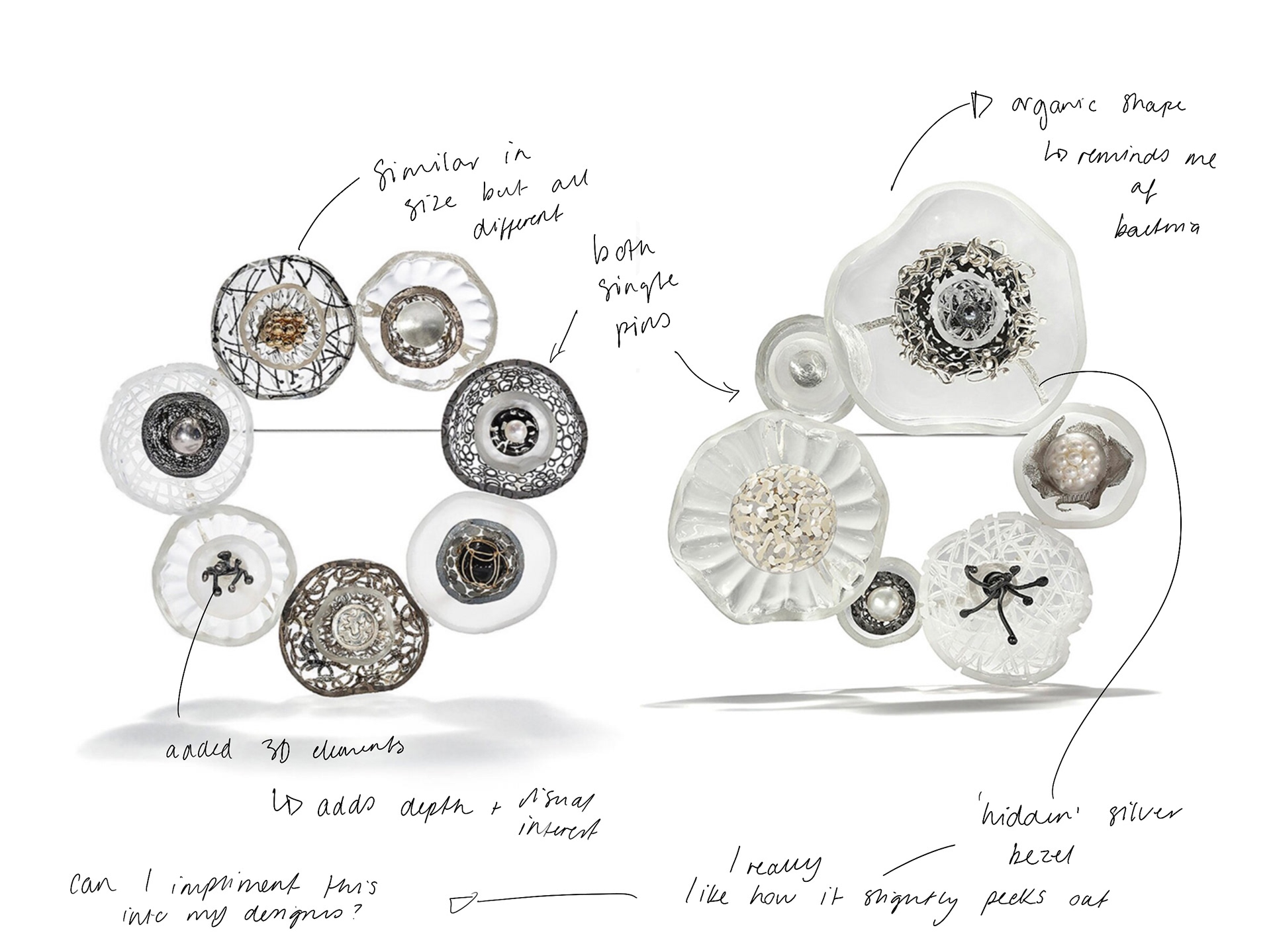 This process of sketching, modelling, and digital experimentation has been crucial in ensuring that both the aesthetic and functional aspects of my brooches work.