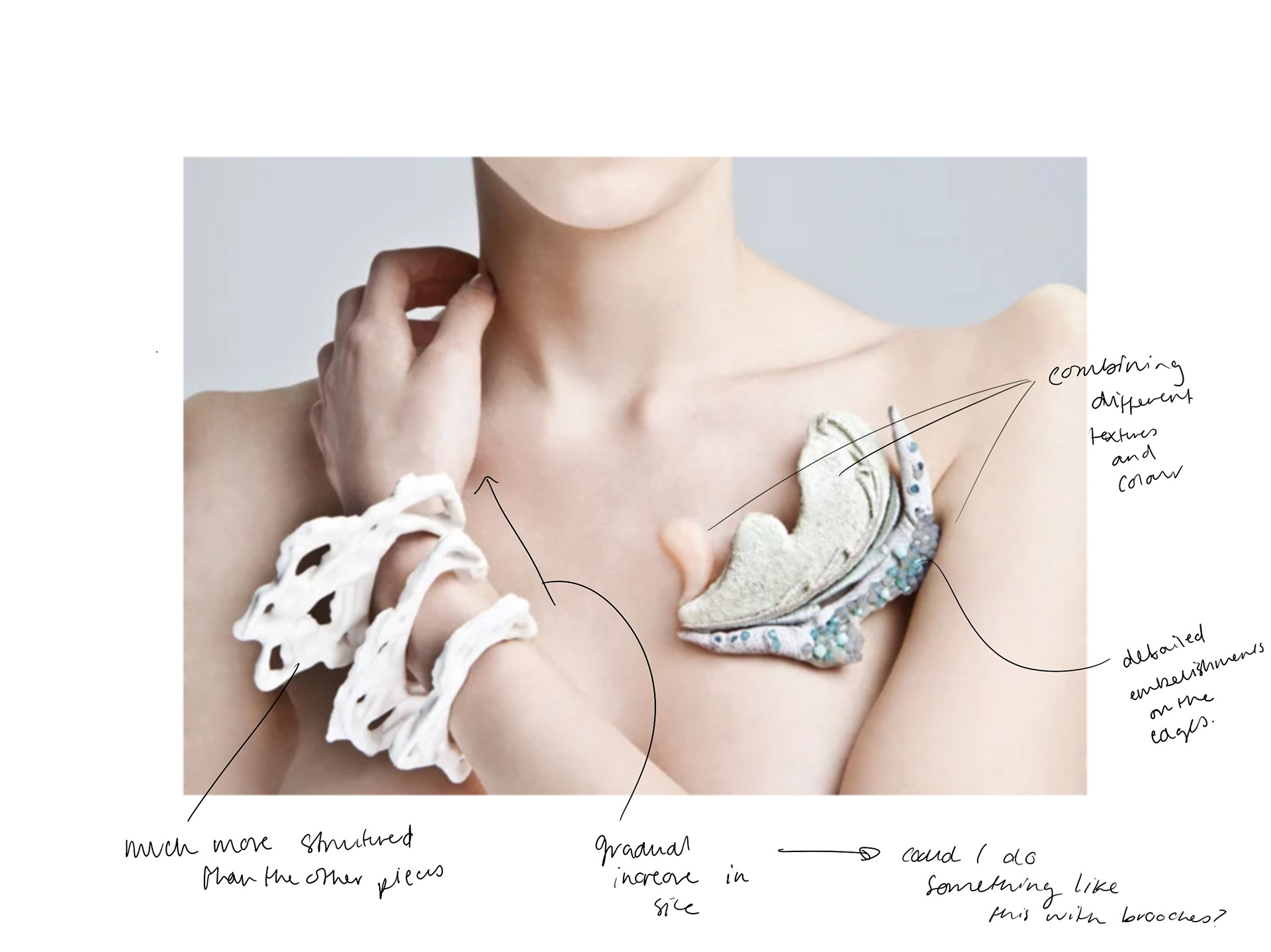 In my first tutorial with Patricia, I explained how my concept for Synthesis and Resolution (S&R) had evolved slightly since my DC3 report. In that report, I explored the idea of extensions, discussing how both bacteria and jewellery function as extensions of the body. Initially, my proposal focused on the different classifications of bacteria—good, bad, and harmless—to create a series of brooches containing these bacteria. However, after writing my essay, I became more intrigued by the broader concept of extensions. Looking back at Unit X, I realised I had been using this idea without even realising it.