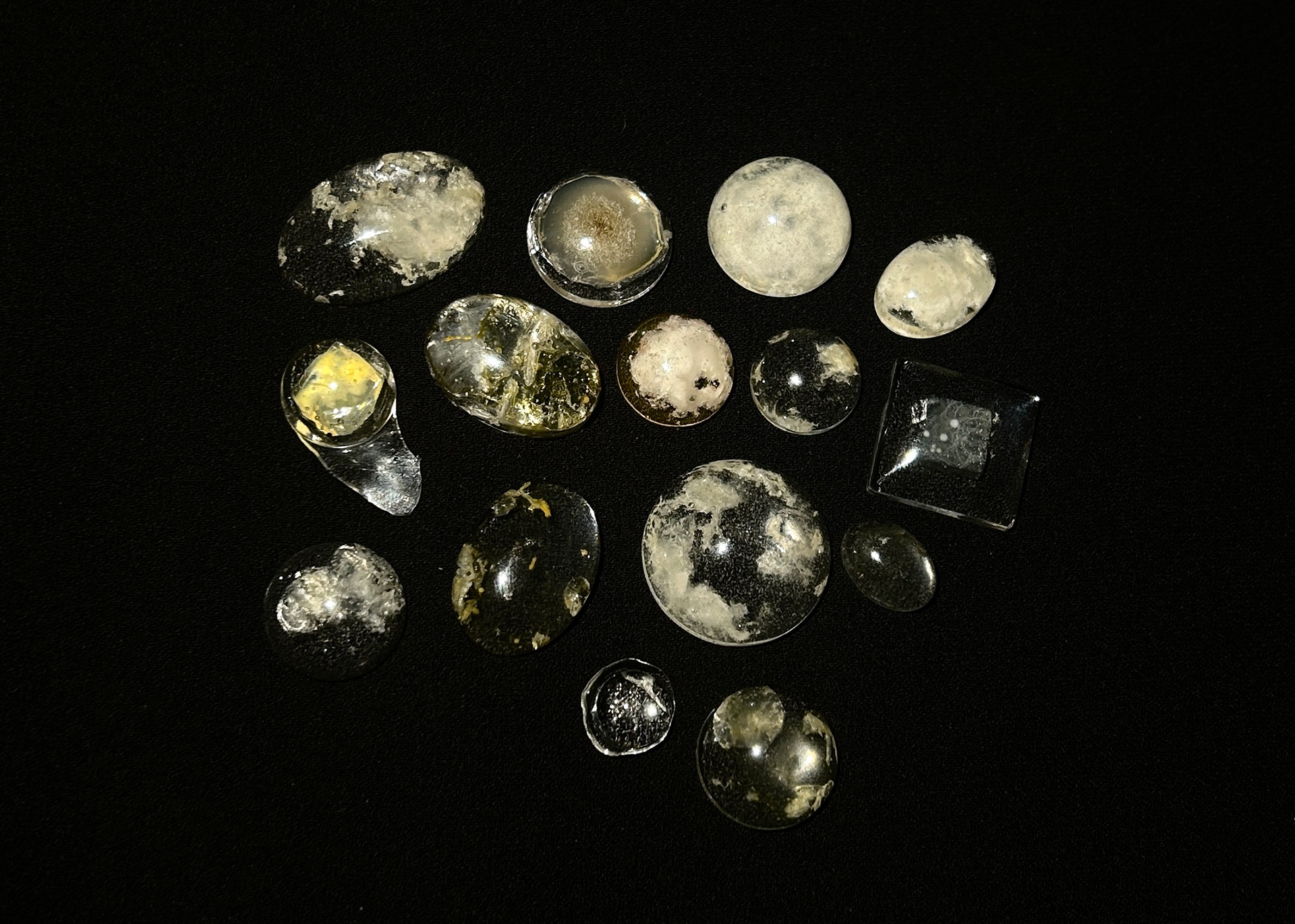 For some of the stones, I used some of the bacteria still connected to the nutrient agar. I used a craft knife to gently remove pieces of the agar and transferred them onto a layer of the resin already in the mould. I wanted to experiment with keeping the original composition the bacteria had made, especially the fibrous ones that intertwine with each other.