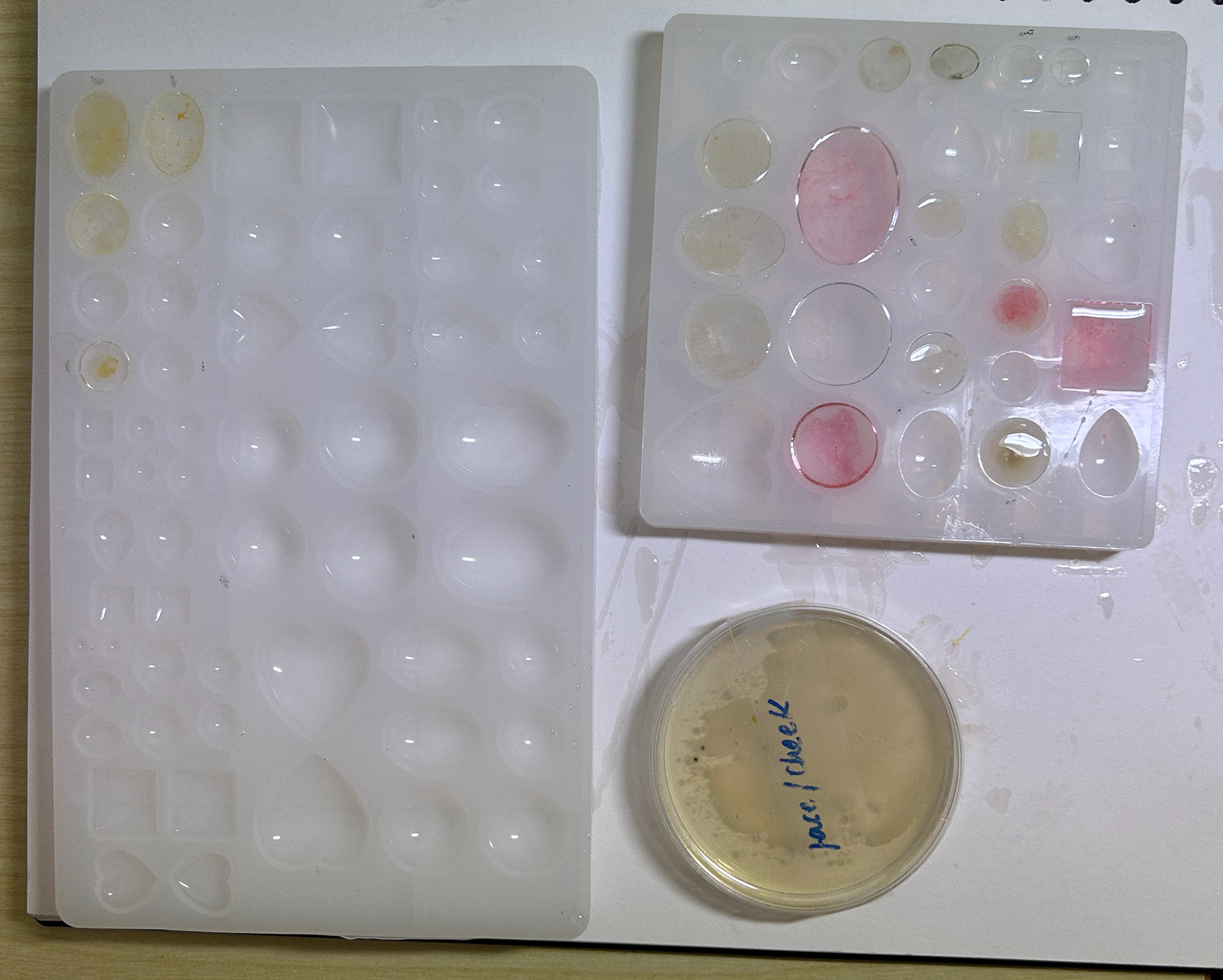 To transfer the bacteria into the silicone moulds, I mixed equal parts of resin and hardener into a plastic cup and poured them directly into the Petri dishes. I could then use a wooden stick and 'scrape' the bacteria from the plate and mix it with the resin. After that, I could then use the wooden stick to transfer the resin-bacteria mixture into the moulds. For the three larger pink moulds, I added pink dye. This was because I was estimating how much resin I should mix up, as I have never used epoxy before and wasn't too sure how much I needed. I added the dye so I could see how much resin was left over after I had used the rest of the bacteria. This has given me a better idea of how much resin I would need if I were to make more stones, resulting in less waste material.