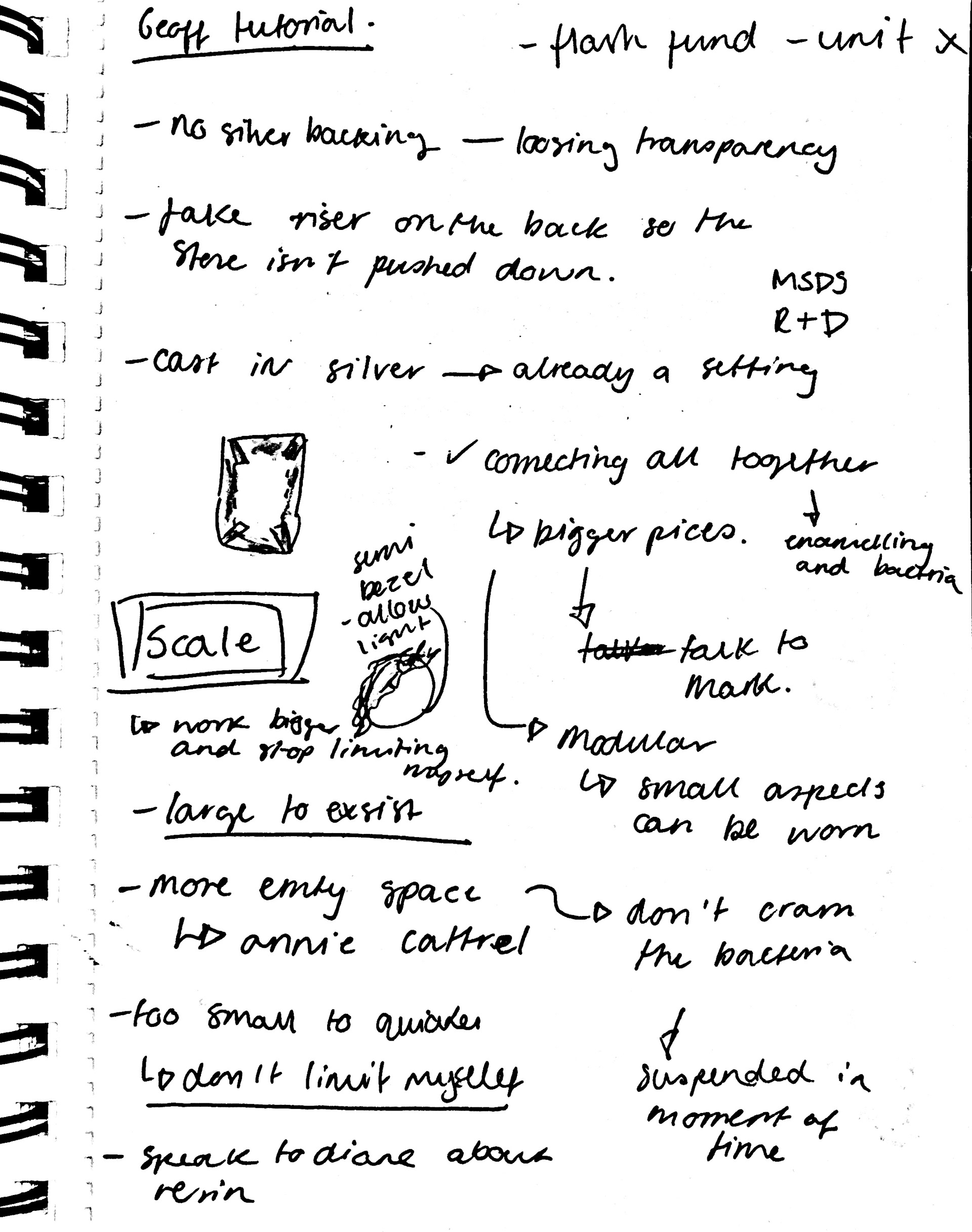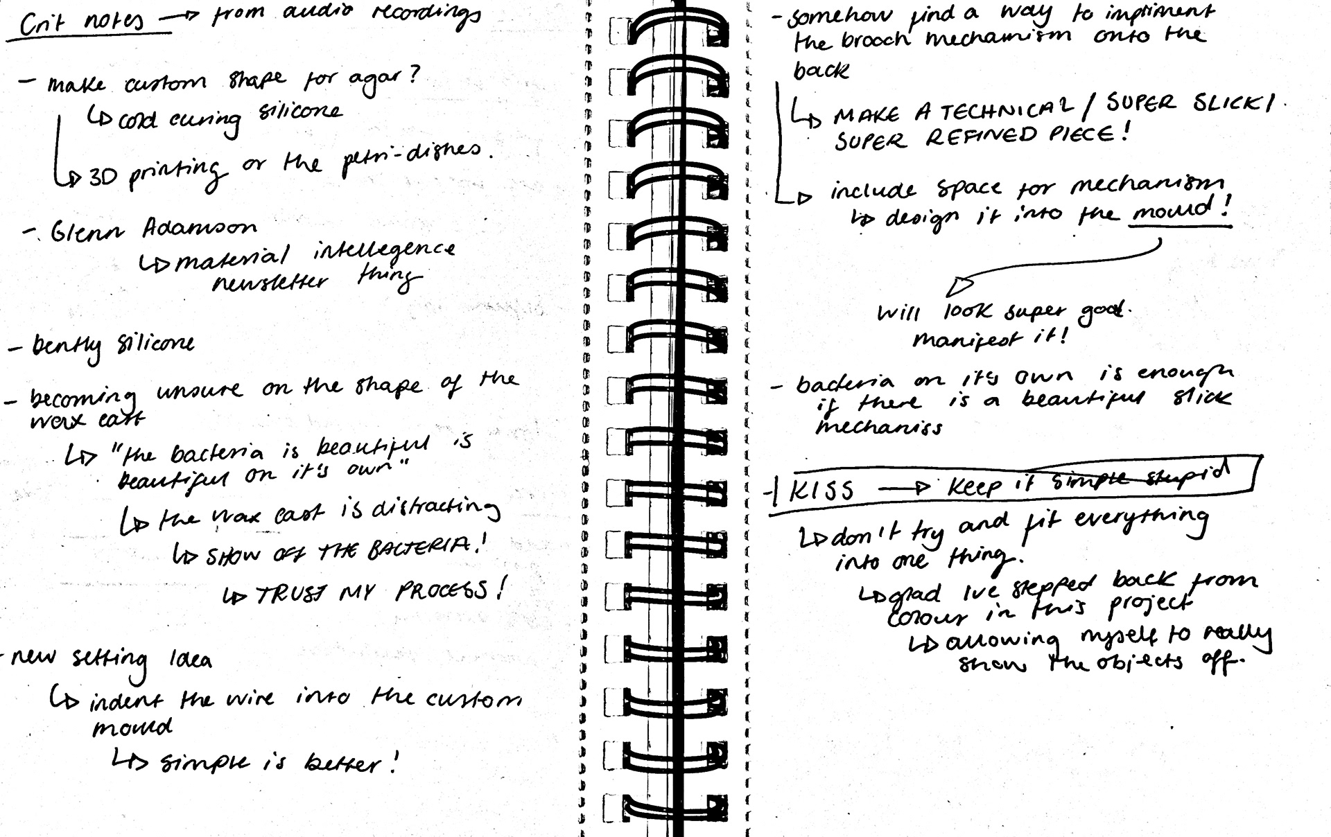 Finally, Geoff recommended that I move away from instinctively using bezel settings, as they block light and don’t showcase the bacteria in the best way. While I’ve relied on this setting style to practice my technical skills, I've realised that it is time to experiment with settings that allow more light through the resin, highlighting the bacteria better.